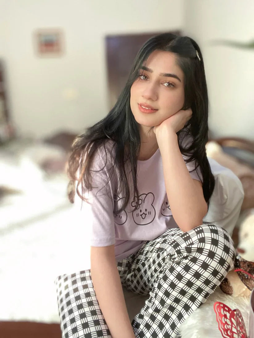 - Product Name : Lilac Cute Emojis With Check Printed Half Sleeves Printed Trouser Night Suit